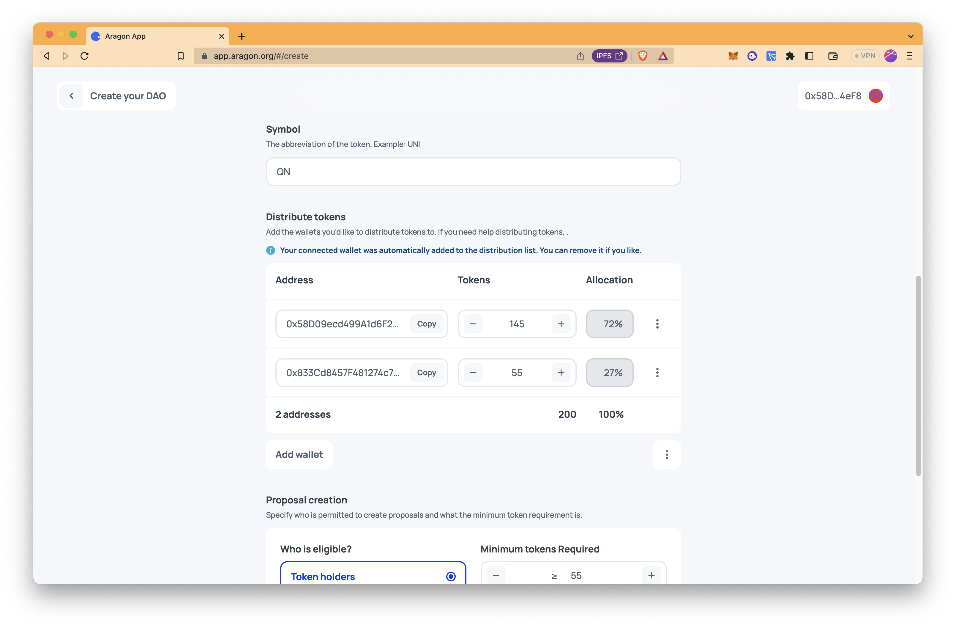 If you select "Token holders" as those who can participate in governance, the token name, the token symbol, the wallet addresses that you would like to distribute tokens, and token amounts for each wallet address are required.